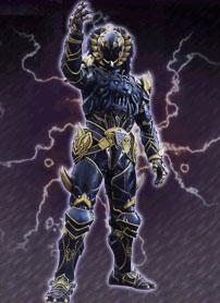 Mele's suit looks great and it has a lot of detail. The green and purple work really well with the yellow highlights. It highlights the chameleon look really well. The sculpting for the chameleon head on the chest-plate is nice and I particularly like the red chameleon tongue coming down from it. The suit overall has this really nice scale pattern to it. The Rinjyuden emblem looks great on the belt.