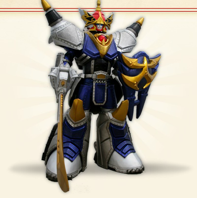 Unlike the other Gekirangers, Ken doesn't summon a GekiBeast to create his mecha. His mecha SaiDaiOh is basically formed from a giant rhino statue that holds the soul of Brusa Li. I love SaiDaiOh's design. It looks like a powerful warrior. The head looks great in red with gold spikes on both sides. The white compliments the blue perfectly and both work really well with the gold.